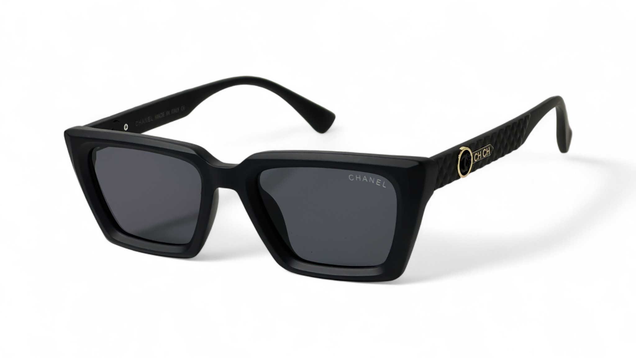 Noirvella Rectangle Sunglasses in Premium Acetate, designed with a Bold Fit for high-fashion appeal. These frames feature a matte black finish with quilted temples and gold detailing, offering a perfect balance of luxury and sophistication. A go-to style for those who love statement elegance and timeless designer charm.